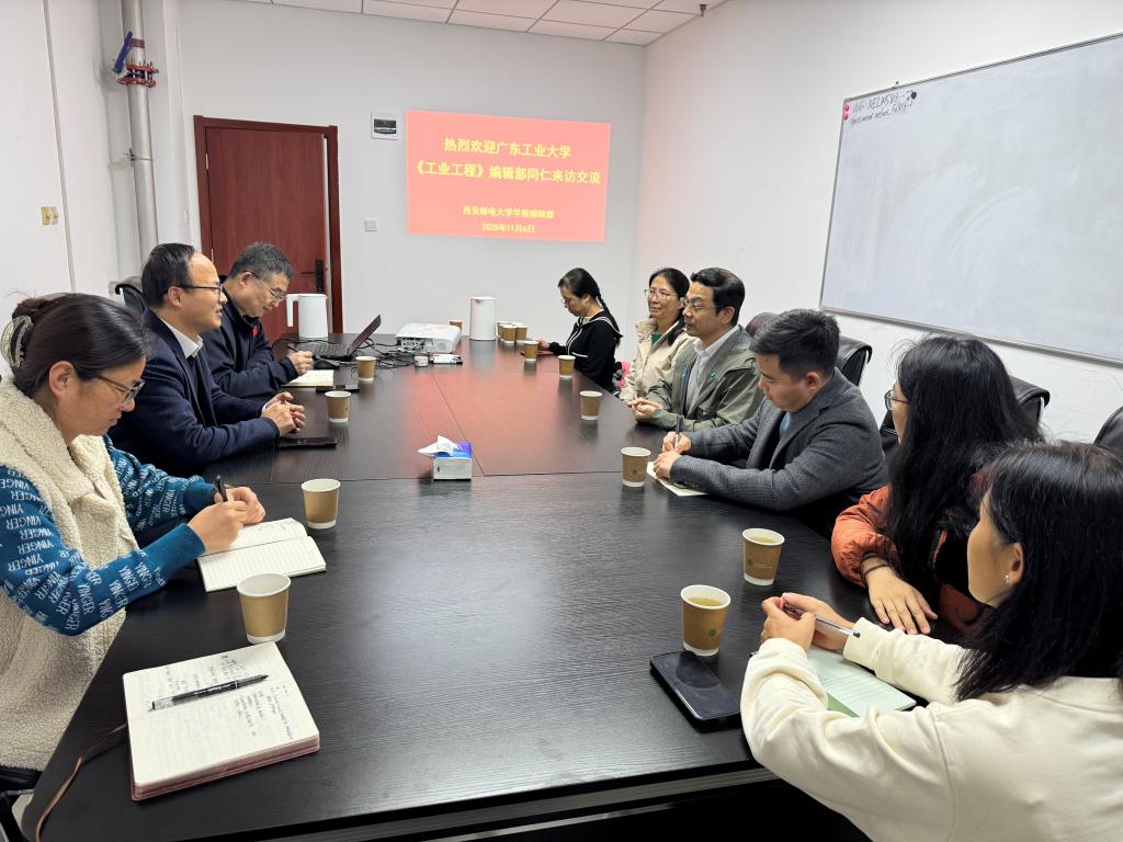 韩江卫对傅惠一行的来访表示欢迎,并从办刊历史沿革、栏目特色定位、团队建设发展等维度,详细介绍了《西安邮电大学学报》的基本情况,重点分享了我校近年来在专业化办刊、学术质量提升、期刊影响力建设等方面的探索实践与成效。他指出,广东工业大学期刊中心管理的《工业工程》《广东工业大学学报》《社会工作与管理》等刊物,在学科建设深度对接、学术资源整合利用、行业影响力塑造等方面成果突出,希望以此次交流为契机,双方加强经验共享、优势互补,推动办刊水平共同提升。
