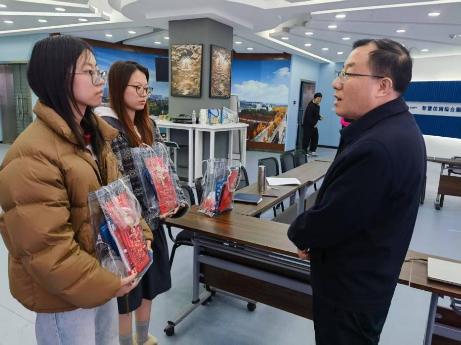 活动期间,学院领导班子成员深入雁塔校区考研自习室,将考研加油礼包送给每位考研学子。礼包内含文具、巧克力、苹果、橙子、暖宝宝贴等物品,寓意“迎来晨光、巧克难题、平安顺利、成功上岸”等美好祝愿。