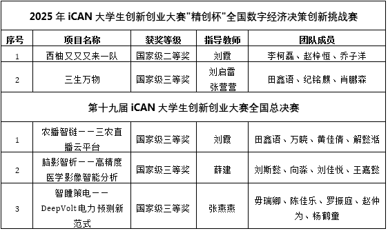 本网讯(通讯员 刘霞)近日,2025年iCAN大学生创新创业大赛各赛道赛事相继举办。我校学生在iCAN大学生创新创业大赛“精创杯”全国数字经济决策创新挑战赛与第十九届iCAN大学生创新创业大赛全国总决赛中共获国家级二等奖1项、三等奖4项。