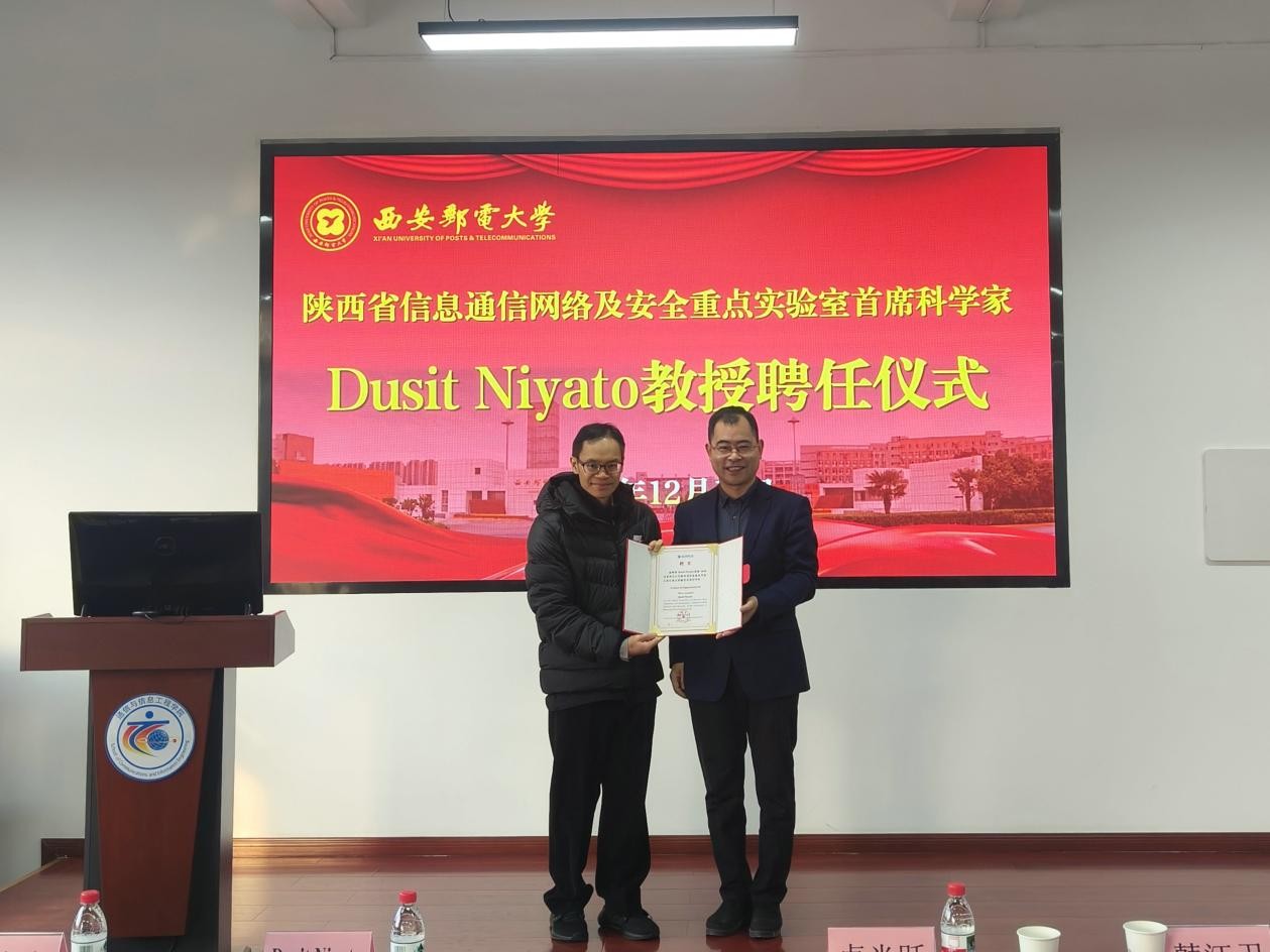 本网讯(通讯员 杨会杰)12月19日上午,我校举行陕西省信息通信网络及安全重点实验室首席科学家Dusit Niyato教授聘任仪式暨专家报告会。新加坡南洋理工大学Dusit Niyato教授、广东工业大学康嘉文教授、吉林大学孙庚教授及南洋理工大学青年学者代表,我校校长卢光跃,人事处、通信与信息工程学院负责人及师生代表参加仪式。聘任仪式由副校长韩江卫主持。