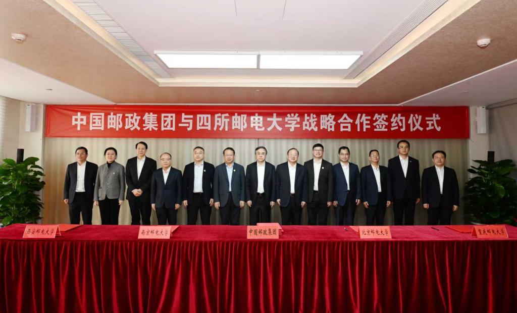 本网讯(通讯员 李莹)3月12日,中国邮政集团有限公司与北京邮电大学、南京邮电大学、重庆邮电大学、西安邮电大学在中国邮政集团总部举行工作会谈,同步签署战略合作协议。中国邮政集团党组书记、董事长刘爱力,党组副书记、总经理郑国雨,党组副书记粟健,党组成员、副总经理温少祺、王俭,我校校长卢光跃,以及另外三所邮电高校相关校领导出席活动。副校长楼旭明代表学校与中国邮政集团签署协议。