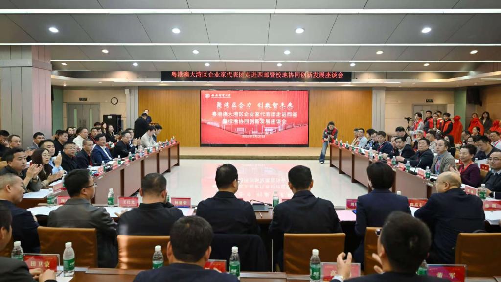 本网讯(通讯员 王欣妍)3月27日下午,“聚湾区合力 创数智未来”粤港澳大湾区企业家代表团走进西邮暨校地协同创新发展座谈会在我校长安校区学术交流中心举办。我校党委书记马宁,校长卢光跃,陕西省政协常委、陕西省工商联副主席陈高志,港区宁夏回族自治区政协委员、我校粤港澳大湾区校友联合会会长何伟宁,西安市人民政府驻深圳办事处经济联络处处长杨德荣,西安市长安区人民政府副区长周晓健等出席会议。座谈会由副校长韩江卫主持。粤港澳大湾区企业家代表团全体成员、陕西高校深圳校友联合会代表、全国各高校粤港澳大湾区校友会代表、各商协会代表、知名企业嘉宾、校内各教学科研单位负责人、属地政府相关部门负责人共130余人参会。