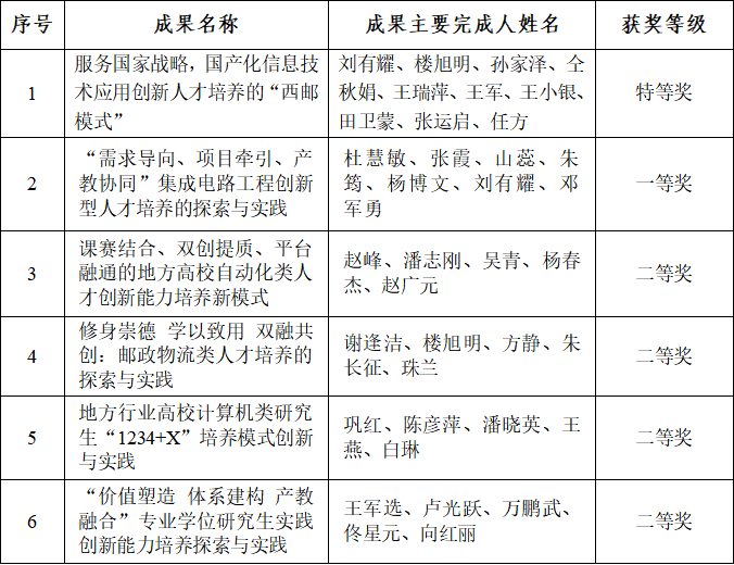 近年来,学校始终坚持立德树人根本任务,主动对接国家战略需求和区域经济社会发展需要,持续深化教育教学改革,在信创人才培养、产教协同育人、学生创新实践能力提升、人才培养模式创新等方面,形成了一批有影响、可推广的教学成果,取得显著成效。学校将进一步做好本次获奖教学成果的推广应用,充分发挥优秀教学成果示范引领作用,持续深化教育教学综合改革,着力培育凝练更多高水平新成果,切实提升人才自主培养质量,为服务国家战略和区域经济高质量发展贡献西邮力量。