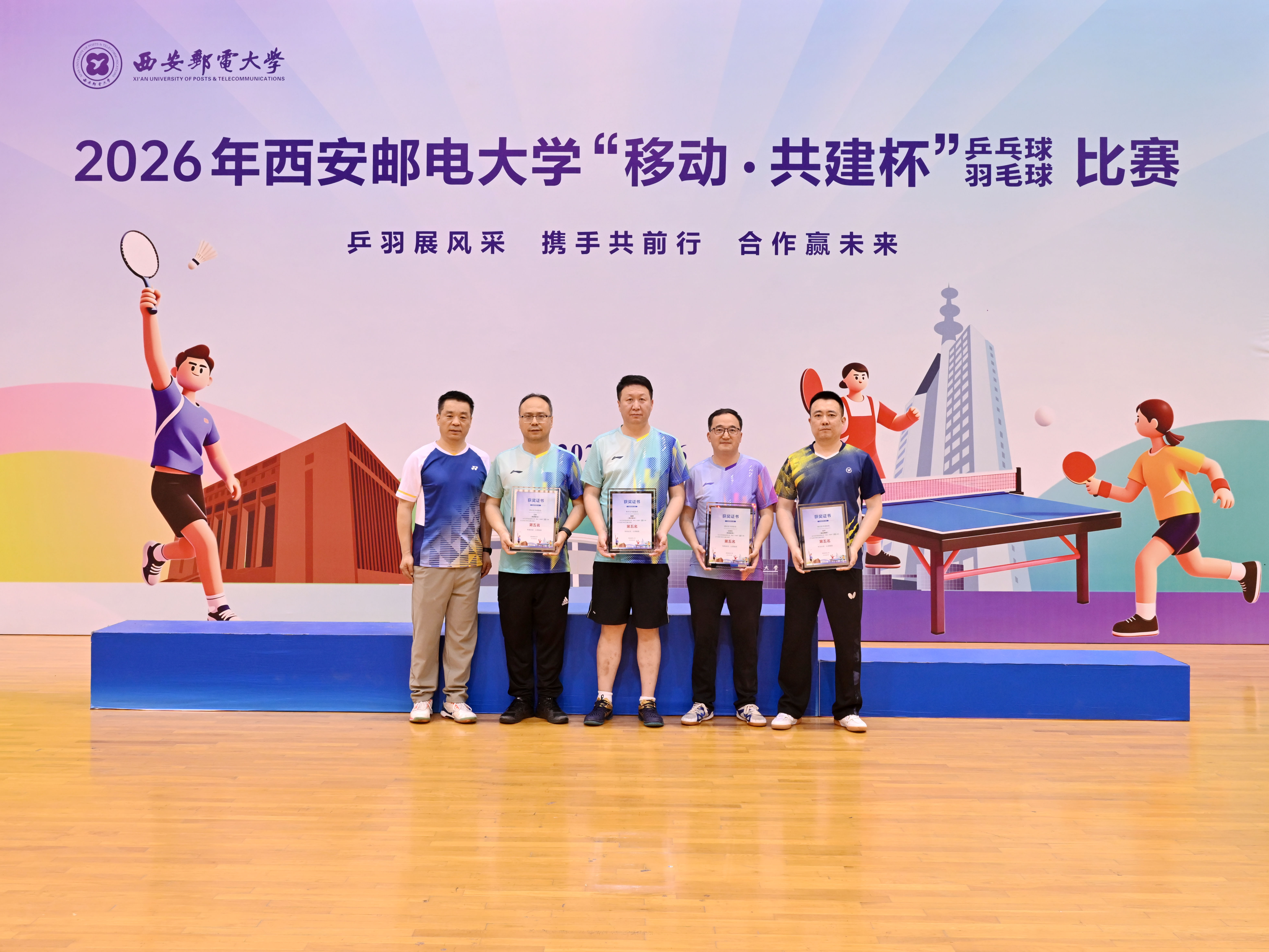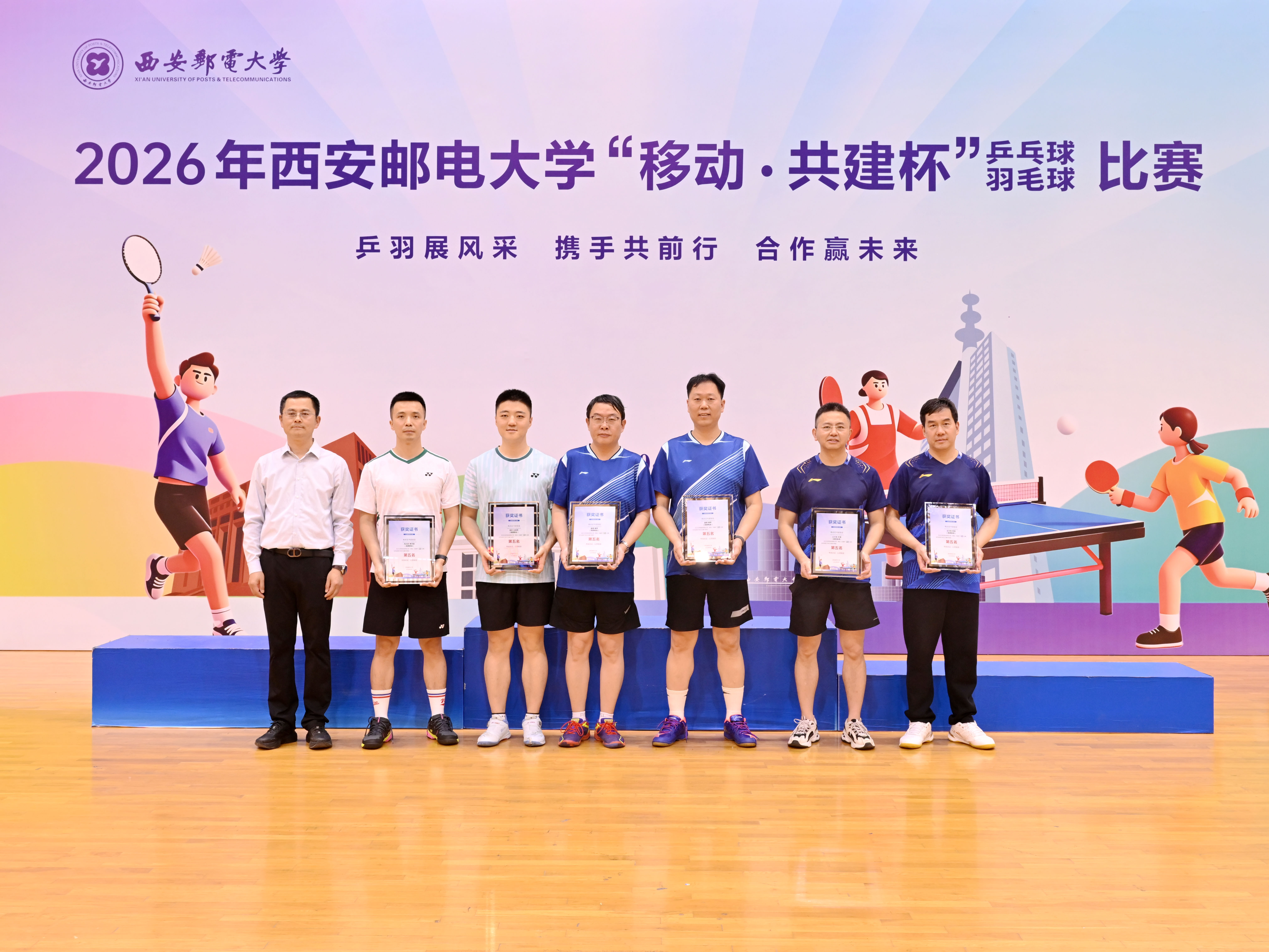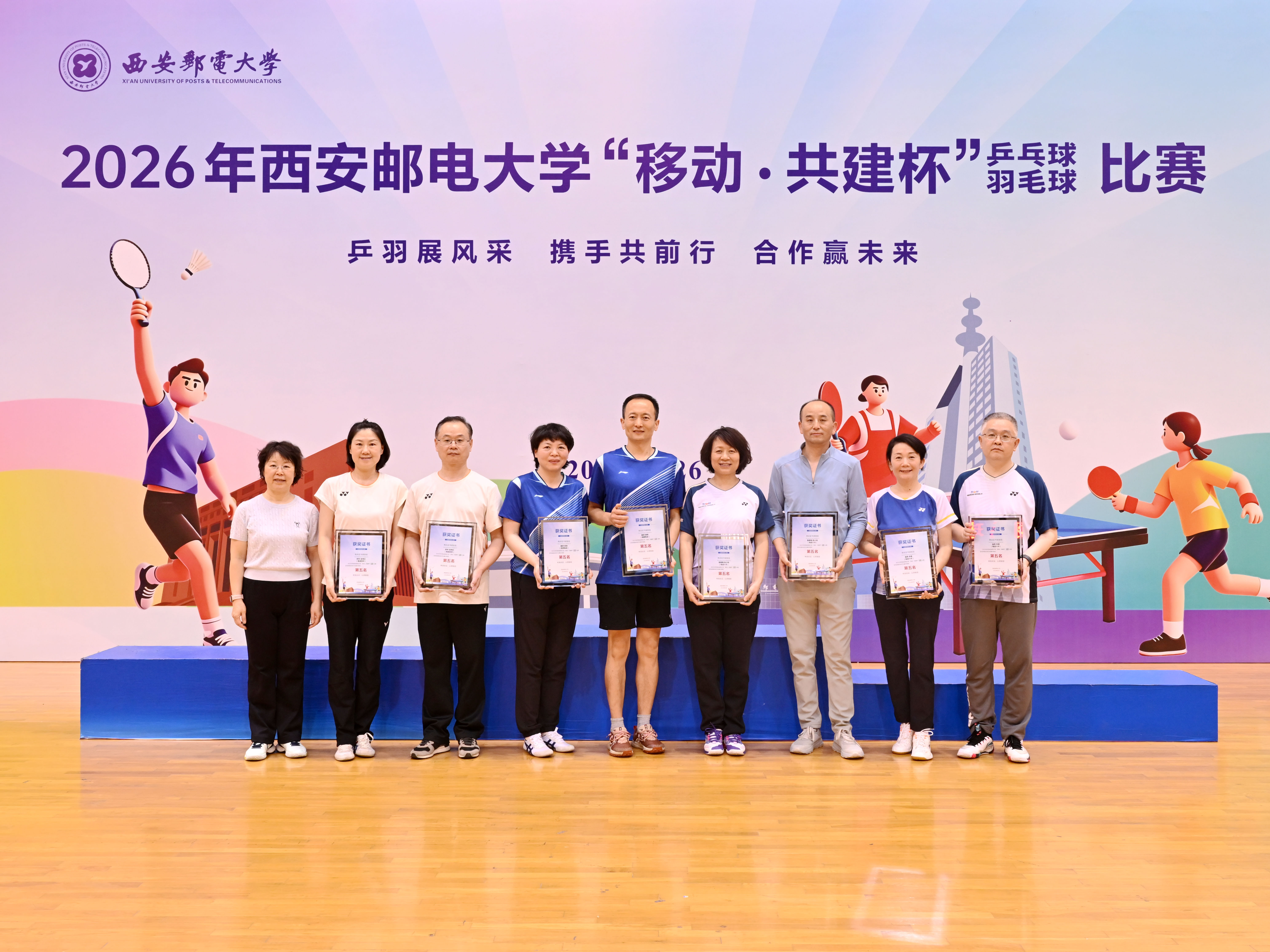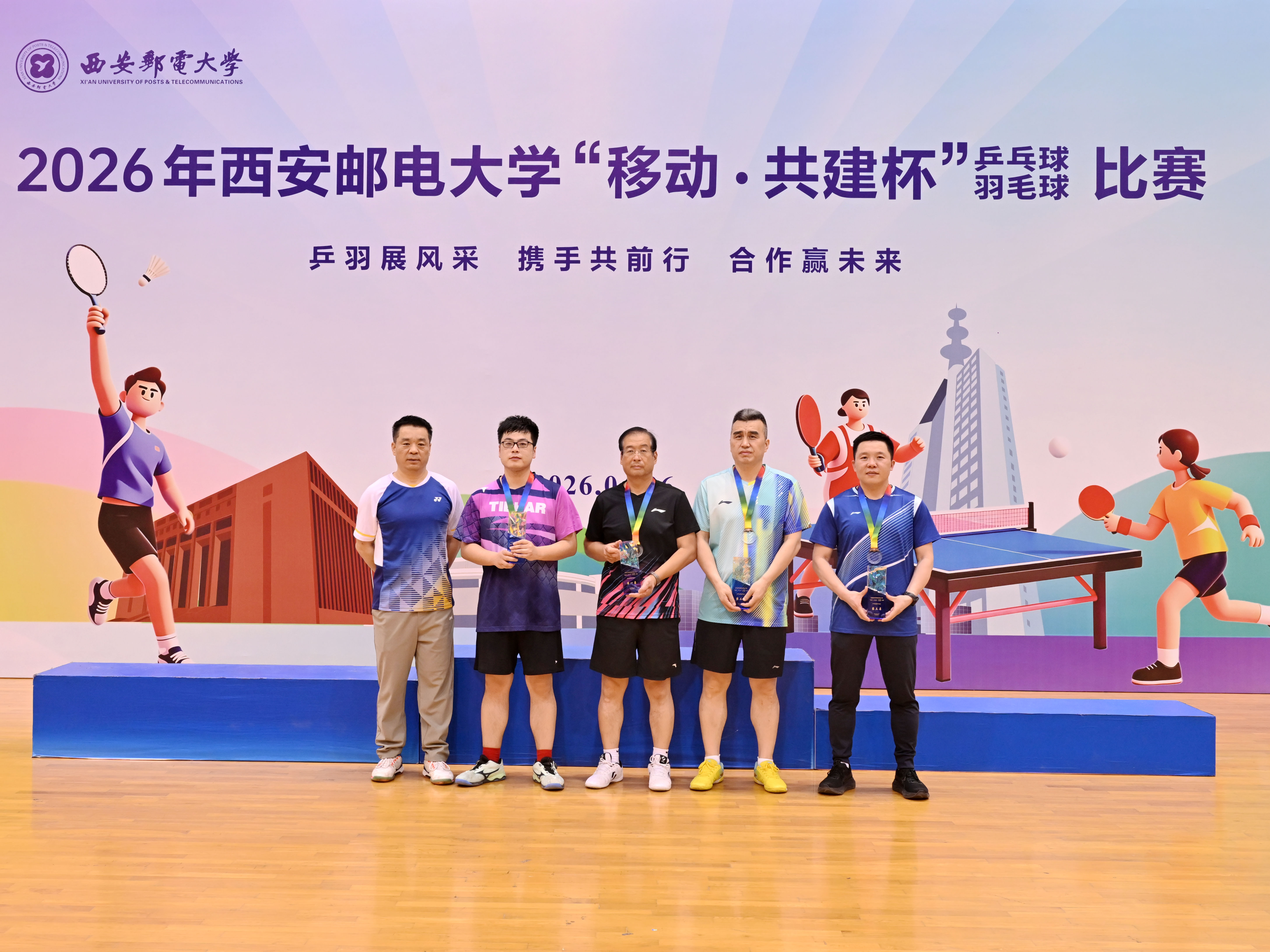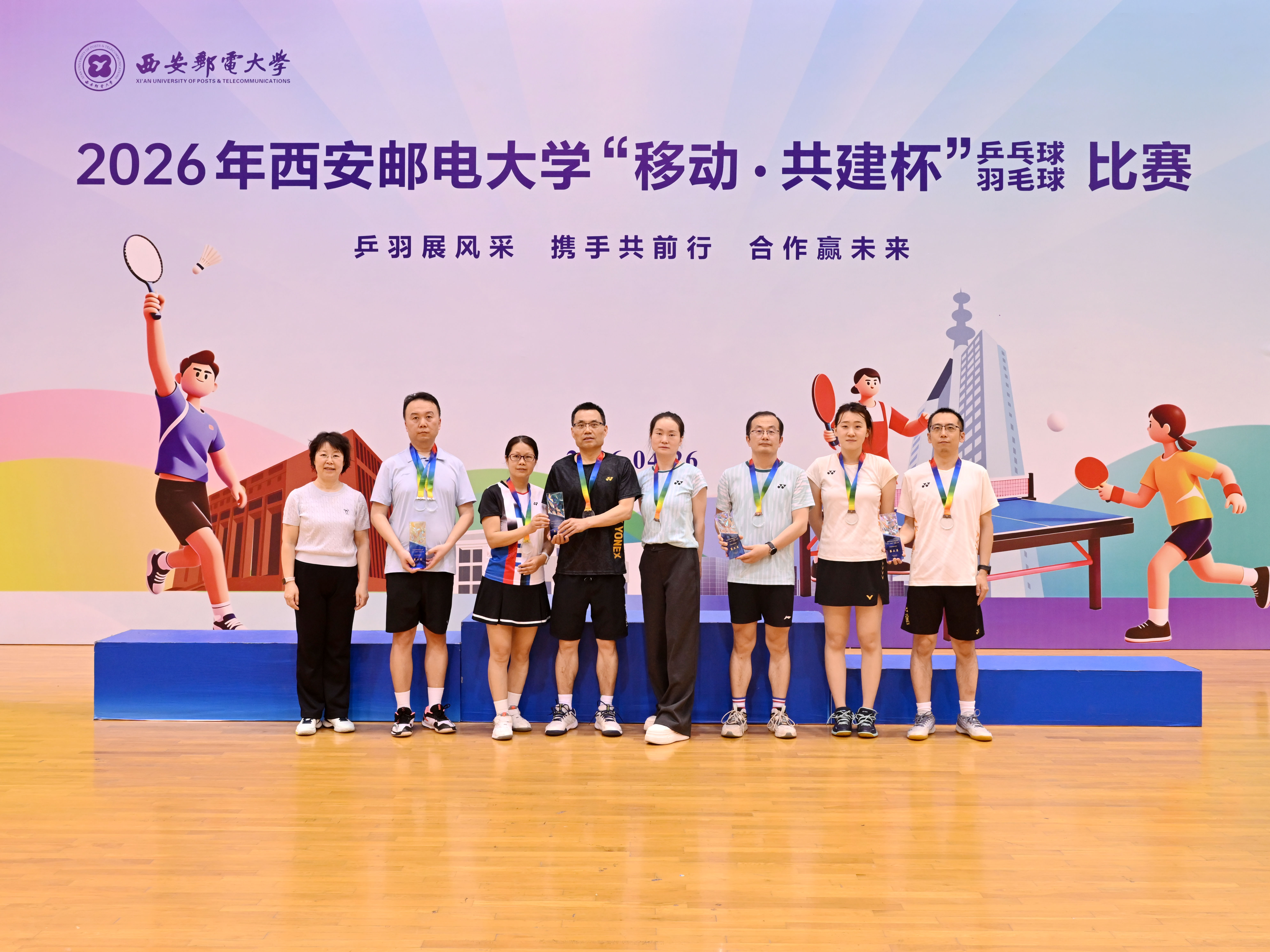 本网讯(通讯员 李睿)校企联动聚合力,乒羽传情促协同。4月26日,2026年西安邮电大学“移动·共建杯”乒乓球、羽毛球比赛在长安校区西区体育馆开赛。校党委书记马宁宣布比赛开幕并为获奖个人及团队颁奖,校长卢光跃致开幕欢迎辞,校党委副书记安增旺主持开幕式,副校长韩江卫出席活动。来自中国移动通信集团陕西有限公司、中国电信股份有限公司陕西分公司、中国联合网络通信有限公司陕西省分公司、中国邮政集团有限公司陕西省分公司、电信科学技术第四研究所有限公司、电信科学技术第十研究所有限公司、华为技术有限公司西安分公司、中兴通讯股份有限公司陕西分公司、国家无线电频谱管理研究所有限公司、中国铁塔股份有限公司陕西省分公司及我校教职工组成的11支代表队、125名运动员齐聚赛场,以球会友、竞展风采。