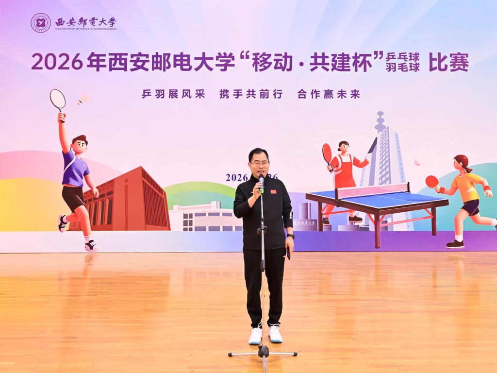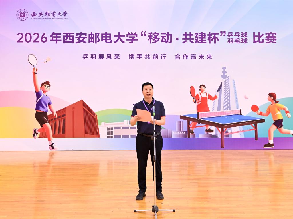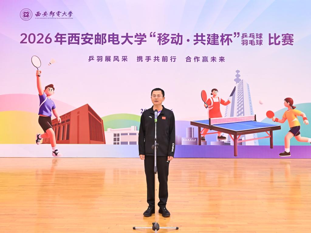 马宁宣布2026年西安邮电大学“移动·共建杯”乒乓球、羽毛球比赛开幕。