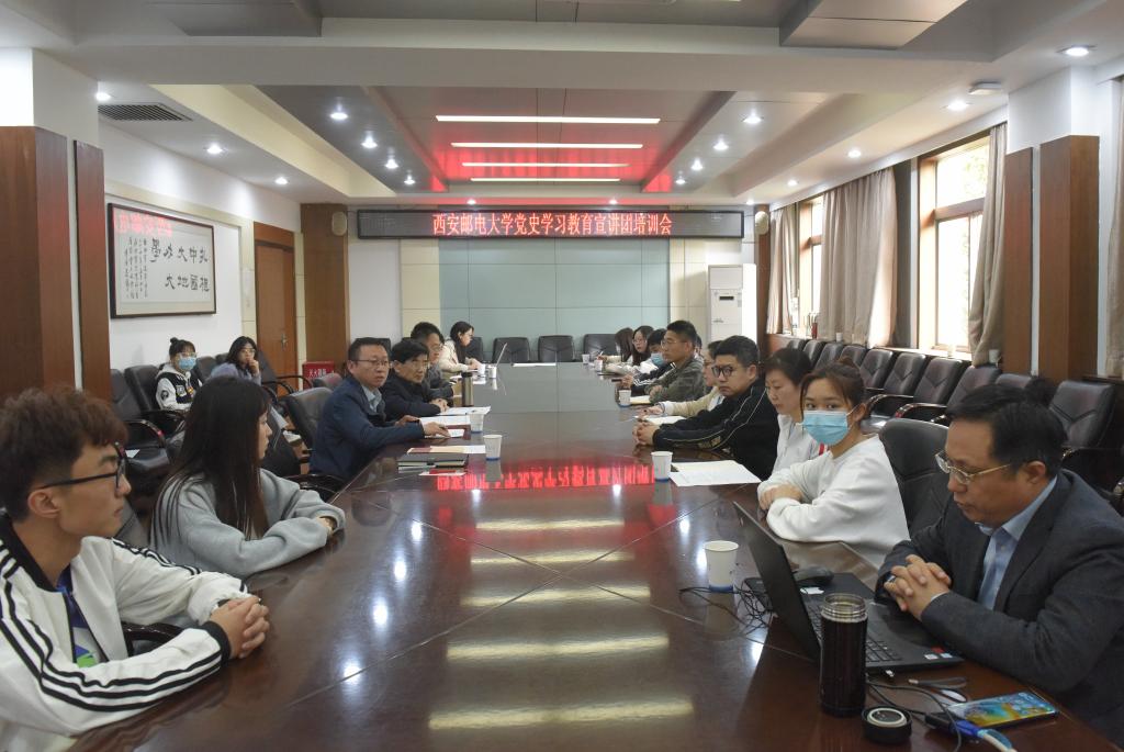 本网讯 (记者 梁海霞)4月17日,我校在长安校区办公楼第一会议室召开党史学习教育宣讲团培训会, 省委党史学习教育宣讲团成员、学校党史学习教育宣讲团副团长、马克思主义学院院长袁武振教授指导培训。校党委委员、组织部部长、党史学习教育领导小组办公室副主任苗忠,学校党史学习教育宣讲团成员和大学生党史宣讲团成员代表参加会议。党委宣传部常务副部长、党史学习教育领导小组办公室副主任吕军战主持会议。