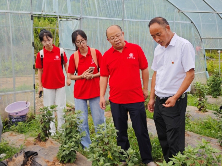 走访调研,探访乡村振兴。7月13日,团队师生走进洛南县景村镇御史村现代农业园区。驻村党支部副书记郭夏锋对实践队员们的到来表示欢迎,并从党建引领、村集体经济、生态农业发展等方面详细介绍了御史村目前的发展现状以及乡村振兴所取得的成果。团队成员了解到去年以来,御史村通过积极探索“党建+”发展模式,推进头雁引领、五雁齐飞、党员创业、乡风文明、三治融合等“五大工程”,夯实乡村振兴基石,唱响“御史故里·金银花香”党建最强音,汇聚乡村振兴发展新动能,为乡村振兴赋能添彩。郭夏锋带领团队成员参观了现代农业园区,团队成员详细了解了大棚种植管理技术要求,并与农业园里的工作人员一起为大棚种植的金丝皇菊除草和药用植物八月瓜进行疏花疏果,体验感受现代农业科技发展变化。