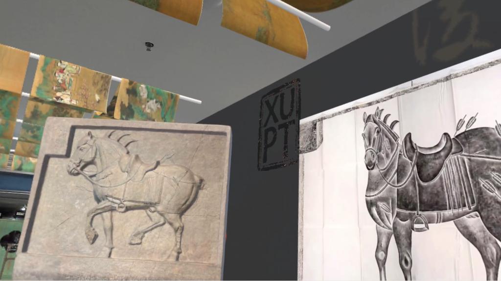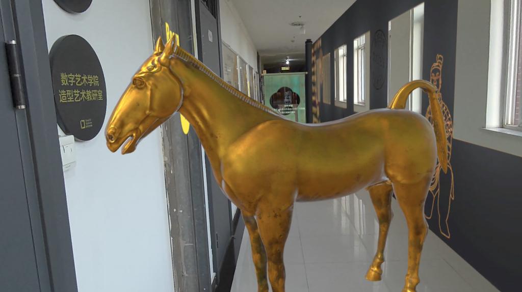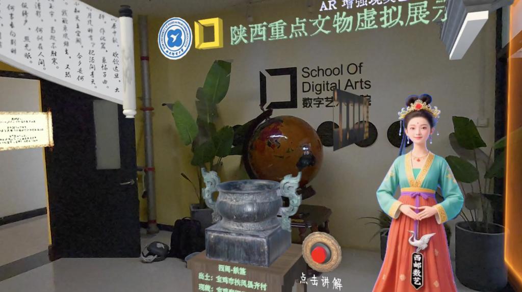 科技破壁,开启文物对话新体验。步入“MR文物走廊”,静态文物模型暗藏“科技密码”,旁侧虚拟讲解按钮即为古今“对话密钥”。学生佩戴MR眼镜轻触按钮,静态文物即刻“活”转,在虚拟场景中还原历史语境,让人沉浸式置身文物所属时代,既可观纹路肌理,又能听历史故事,实现从“观文物”到“悟文化”的深度跨越。走廊内陈列西周青铜礼器、唐昭陵六骏、西汉鎏金马、唐代金丝绣物等文物模型,科技赋能让抽象历史知识可触可感,思政教育从“课堂灌输”转向“体验浸润”。师生穿梭其间,每一次互动都是与历史的深度对话,推动其从历史“旁观者”转变为文化“参与者”,中华优秀传统文化认同感与归属感油然而生,实现真正入脑、入心。