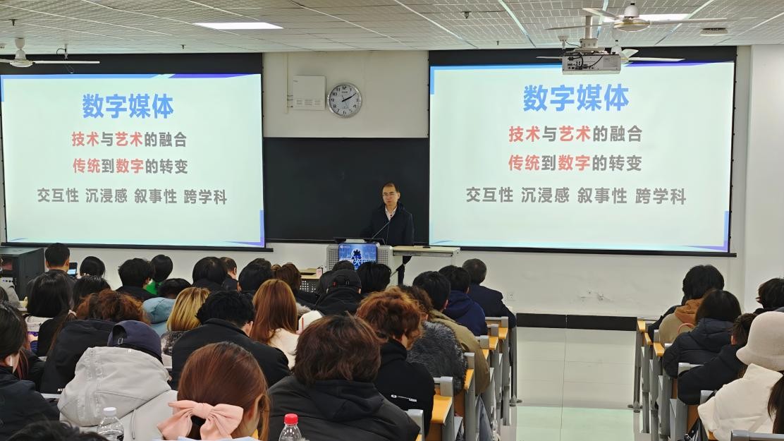 闫兴亚以《“艺工融合” 工科高校戏剧与影视人才培养实践与改革》为题,围绕数字孪生、AIGC、XR大空间交互等前沿技术展开系统分析,全面梳理数字媒体技术在内容生产、创意传播与沉浸式体验中的发展趋势。他还结合国内外多个典型案例,展示了数字孪生技术在工业产区数字化、虚拟展演落地与城市数字化建设中的实践成果。从教育与产业协同发展视角,提出高校数字媒体专业在跨学科融合深化、技术创新驱动、产业协同育人机制构建等方面的创新思路。他认为,高校应立足新质生产力发展导向,持续推动数字艺术教育体系迭代升级与科研成果产业转化落地。会后,闫兴亚应邀参加渭南师范学院传媒学院《2026 版人才培养方案》修订研讨会,在课程体系优化、实践教学质量提升、产学研协同机制完善等方面提出了建设性意见。