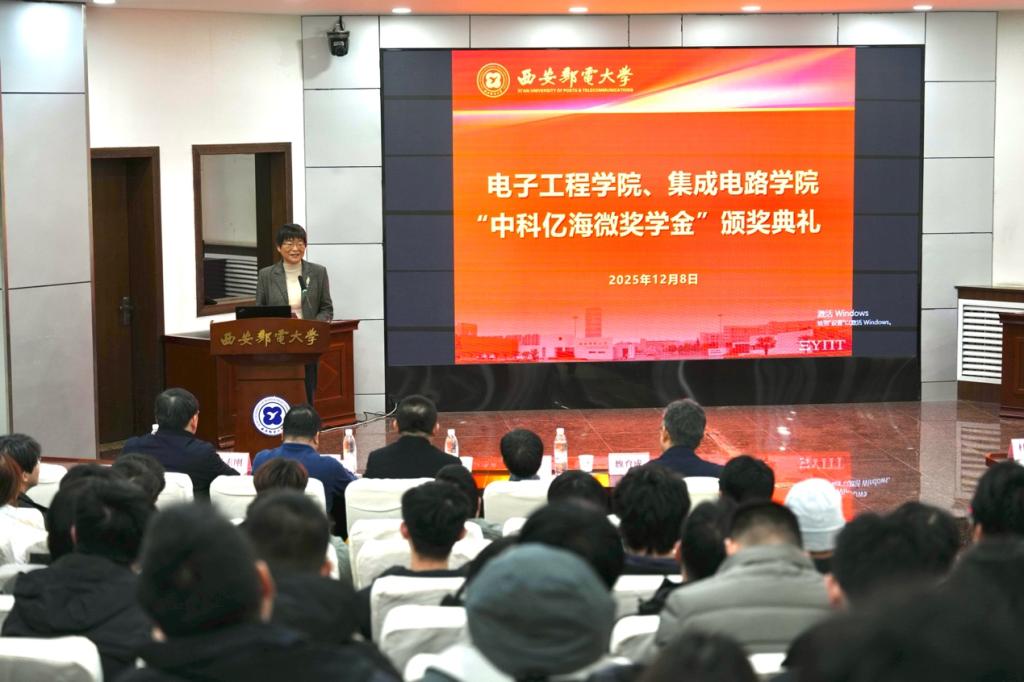 本网讯(通讯员 束永琛)近日,电子工程学院、集成电路学院在长安校区办公楼附一楼报告厅举行2025年“中科亿海微奖学金”颁奖典礼。中科亿海微电子科技(苏州)有限公司总裁魏育成及公司相关负责人,学院领导班子成员、2025级本科生、研究生代表共计200余人参加活动。学院党委副书记马素刚主持颁奖典礼。