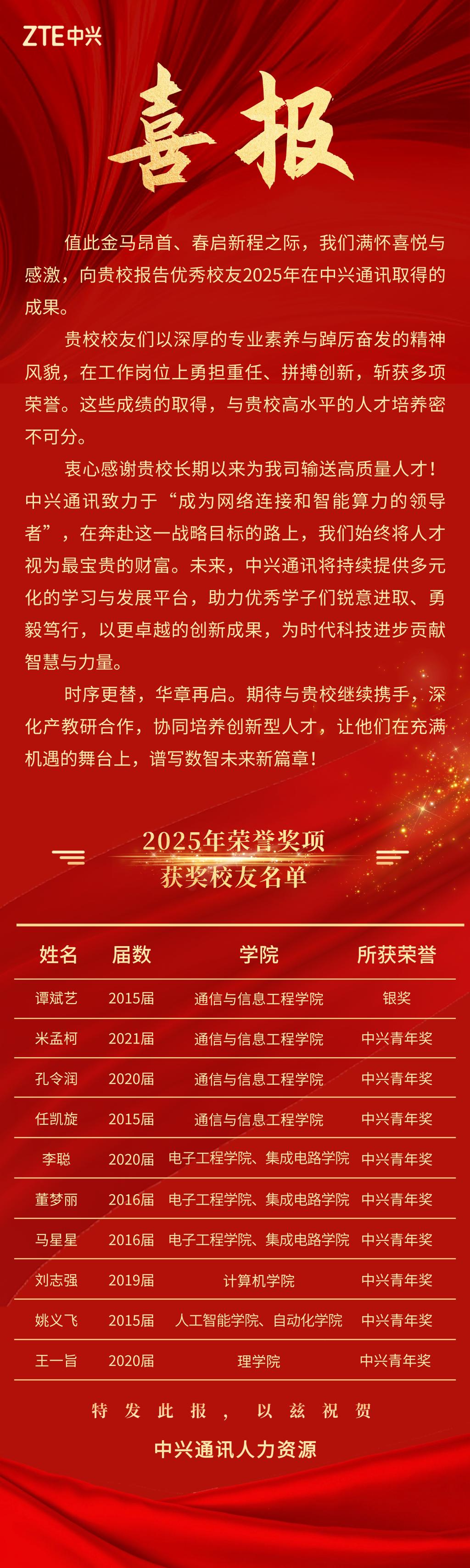本网讯(通讯员 高妍)近日,中兴通讯股份有限公司向我校发来喜报。我校10名毕业生荣获中兴通讯2025年度荣誉奖励,中兴通讯对学校长期以来为公司输送高质量人才表示感谢。