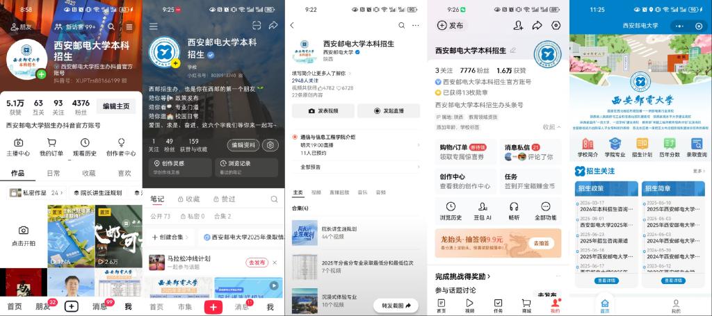 目前,各平台已全面开放关注,考生及家长可在抖音、小红书、今日头条、微信视频号搜索“西安邮电大学本科招生”关注各平台账号,或在微信小程序中搜索同名小程序,畅享一站式报考服务。后续,平台将推出“院长直播答疑”“专业巡礼系列”“高考志愿填报指导”等特色活动。招生咨询热线:029-88166199、029-88166660(志愿填报专用,现已开通);学校官方招生网址:https://zhaosheng.xupt.edu.cn/。