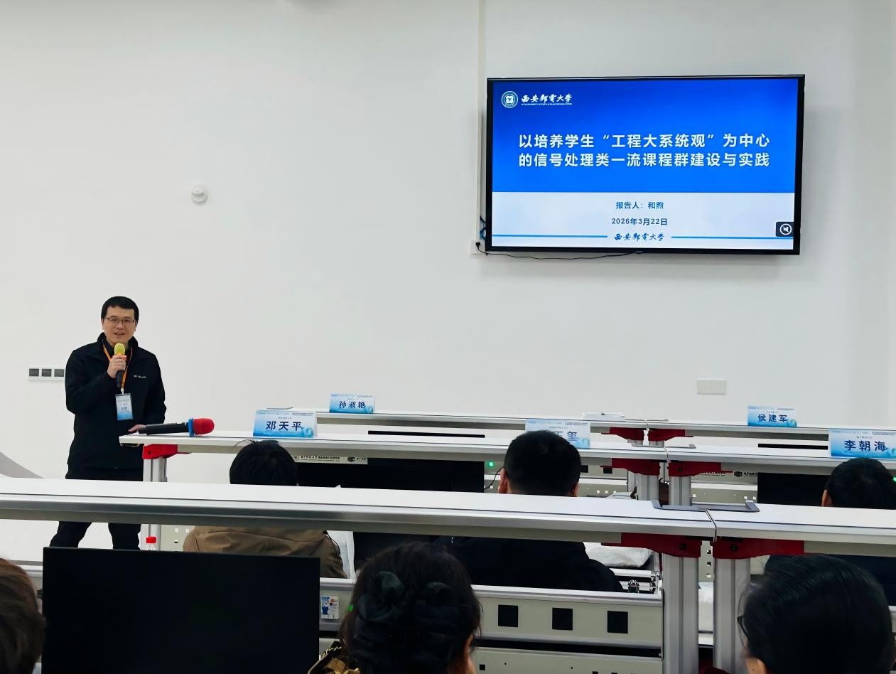研讨交流环节,和煦作题为《以培养学生“工程大系统观”为中心的信号处理类一流课程群建设与实践》的主旨发言,立足学院近年来教学改革成效,围绕OBE教育理念,阐述了以“工程大系统观”为统领、构建 “厚基础、强实践、重创新”三位一体教学体系的实践经验,分享了课程体系与实践教学体系建设中的关键问题及解决路径,为兄弟院校相关专业教学改革提供了有益参考与借鉴。