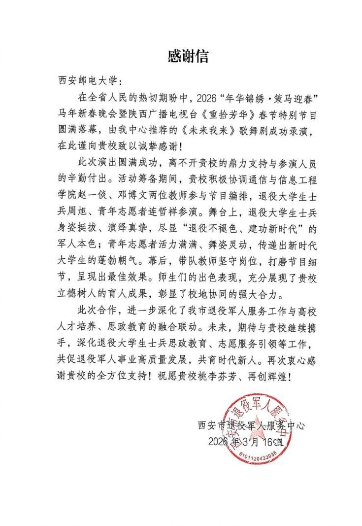褚啸寒对学院长期以来给予退役大学生士兵志愿服务工作的支持表示感谢。他表示,寒假期间学院赵一倓、邓博文两位老师,以及退役大学生士兵、物联网2402班周旭和通工2501班连哲祥两名同学,积极参与了2026“年华锦绣・策马迎春”马年新春晚会暨陕西广播电视台《重拾芳华》春节特别节目歌舞剧《未来我来》的排演工作,圆满完成录演任务,充分展现了西邮师生的良好精神风貌,西安市退役军人服务中心对学院的大力支持与参演师生的辛勤付出致以诚挚谢意,并期待双方在爱国主义教育、志愿服务等方面继续深化合作、携手共进。