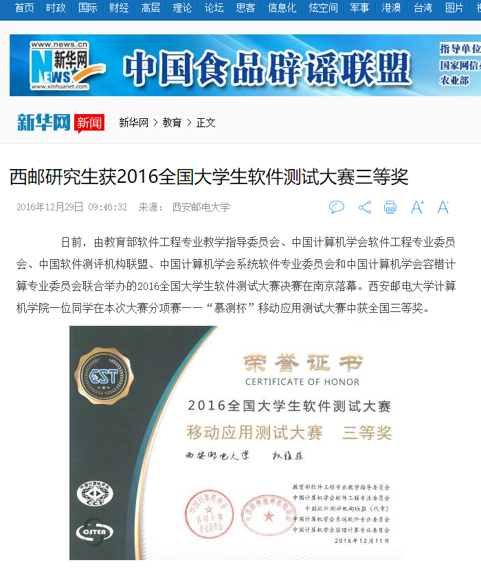 西邮研究生获2016全国大学生软件测试大赛三等奖